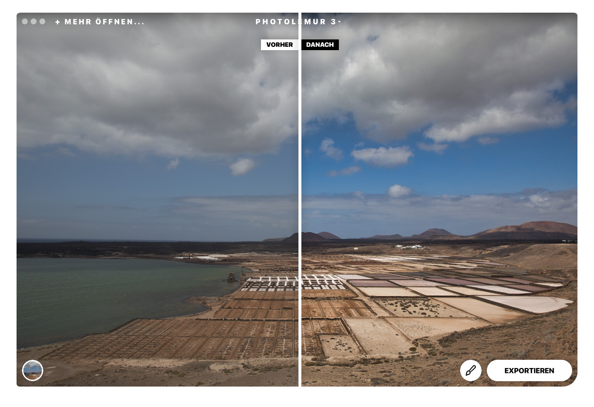 Ist Photolemur 3 fertig mit der Analyse wird das Bild in einer Vorher-Nachher-Ansicht angezeigt. Auf der einen Seite das originale Bild auf der anderen Seite das von Photolemur 3 bearbeitete Bild. Über einen Schieber können die beiden Bereiche variiiert werden.