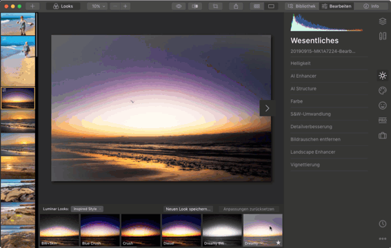 Looks sind ein wesentlicher Bestandteil des Luminar-Systems. Bisher konnte die Auswirkung eines Looks nur über die kleinen Vorschaubilder des jeweiligen Looks beurteilt werden. In Luminar 4.3 wir die Auswirkung des Looks sofort im Bild angezeigt, indem man einfach mit der Maus über das Look-Vorschaubild fährt. Um also die Veränderung des Bildes durch den Look gut beurteilen zu können, ist es also nicht mehr nötig den Look anzuwenden und so die aktuellen Einstellungen zu überschreiben.