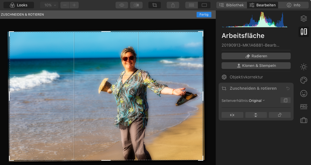 Das Zuschneidewerkzeug Zuschneiden & Rotieren, befindet sich jetzt in der rechten Leiste unter der Objektivkorrektur. Die Bedienelemente sind also nicht mehr über dem Bild angeordnet sondern befinden sich jetzt in der Seitenleiste. Ein Aufruf des Zuschneidewerkzeug ist aber auch über den Button in der Werkzeugleiste über dem Bild möglich. Windows-Benutzer sollen auch eine deutliche Leistungssteigerung erleben, da Bilder nahtlos zugeschnitten werden können.